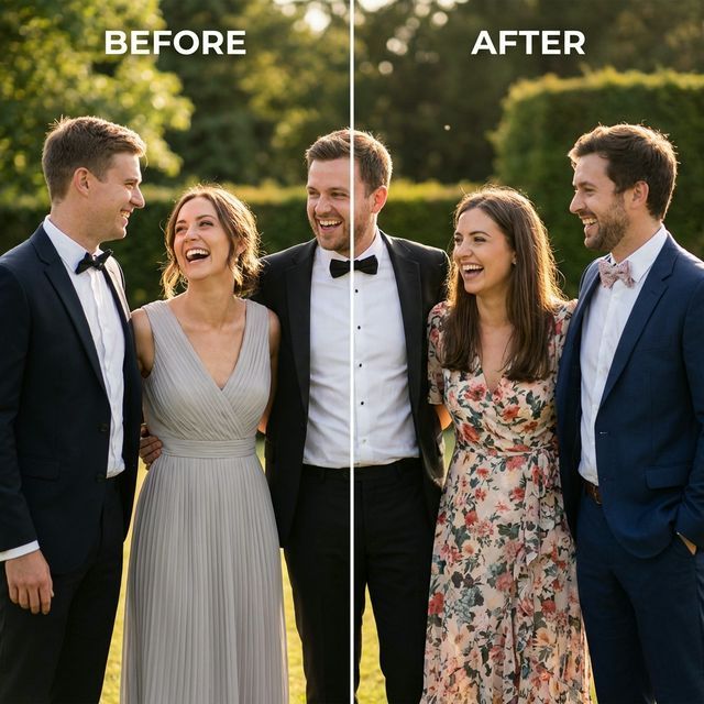 - Anatomical Depth CalibrationThe AI understands where the "person" should physically stand in 3D space. It doesn't just place them over the background; it places them *inside* the group, accounting for overlapping limbs and shoulders.